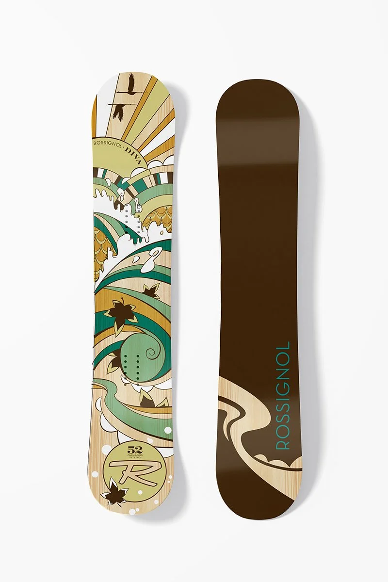 Rossignol / Quiksilver approached me to design these women’s DIVA MAG boards. Their direction was to create art that felt abstract, optimistic and included an aspect of FLOW, their theme for the season. The “ROSSI” boards were concepts for their kid’s division, which unfortunately didn’t make it to production.